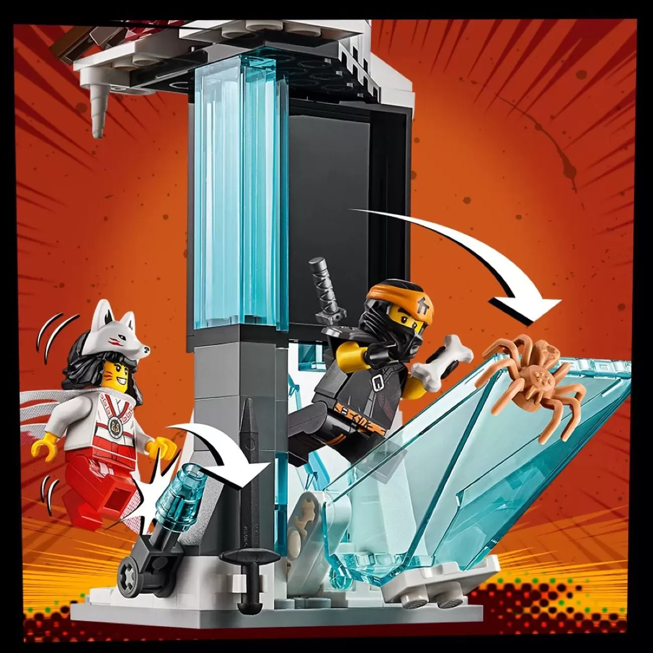 �?Castle of the Forsaken Emperor building features the Ice Emperor's throne, ice arch and a throne-reveal function with an attachment point for Lloyd FS's tornado spinner, 2 towers, a stud-shooting crossbow, weapon storage and assorted weapons and accessory elements including ice skates, ice hockey stick, shovel, katana and a dagger.